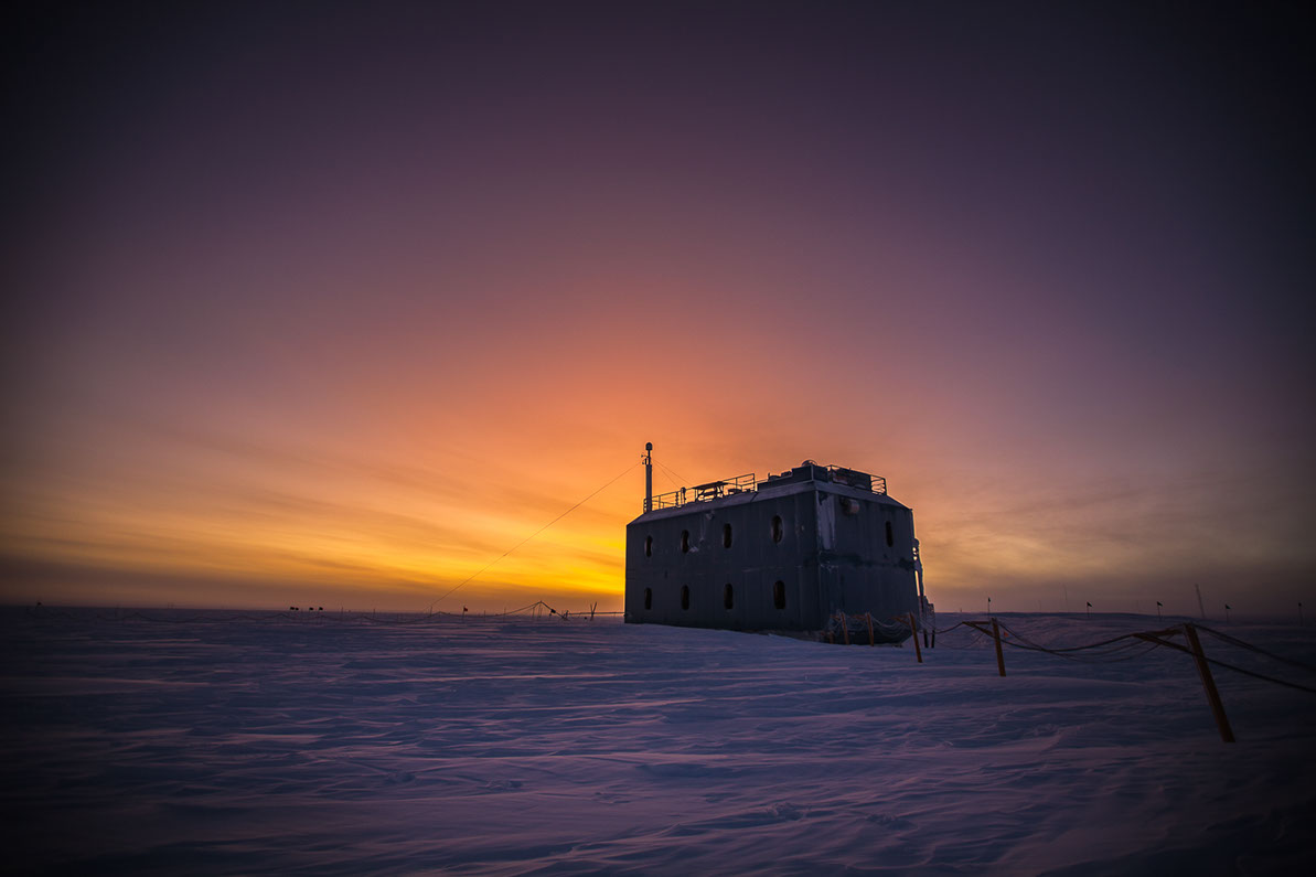 Sunset over the Atmospheric Research Observatory at the South Pole, Antarctica