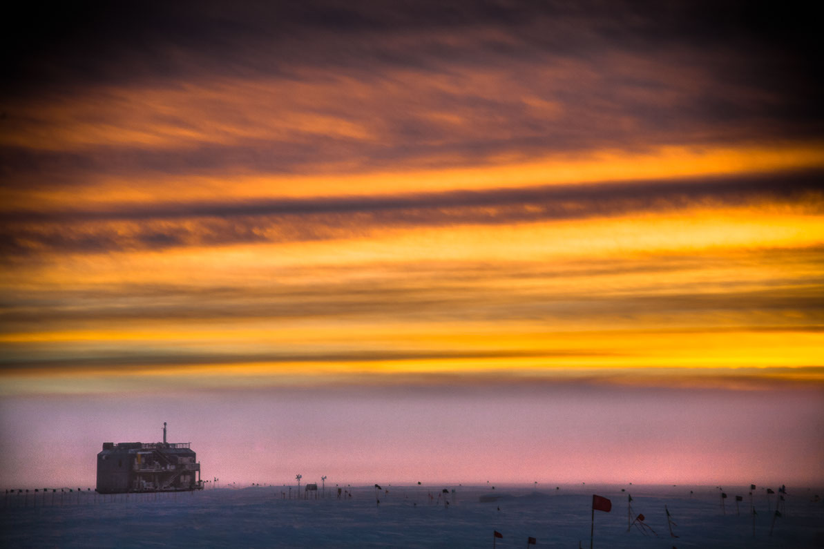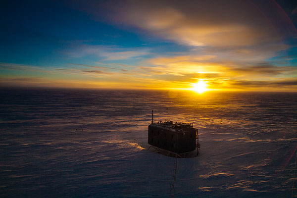 Sunset over the Atmospheric Research Observatory at the South Pole, Antarctica